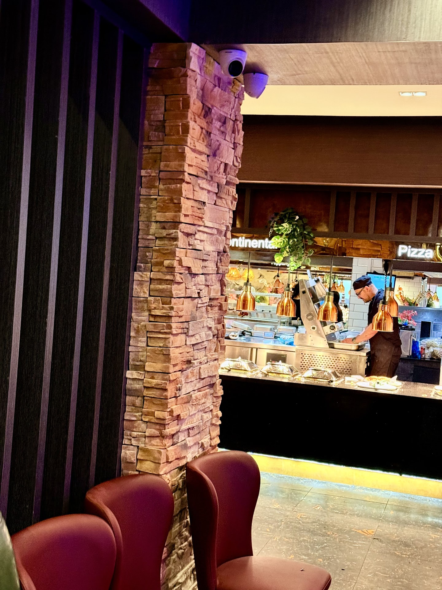 This is a feast for the senses. As you step inside, the vibrant aromas of global cuisine envelop you. The place is busy but spacious and the dining area buzzes with excitement as diners gather around the buffet stations.
