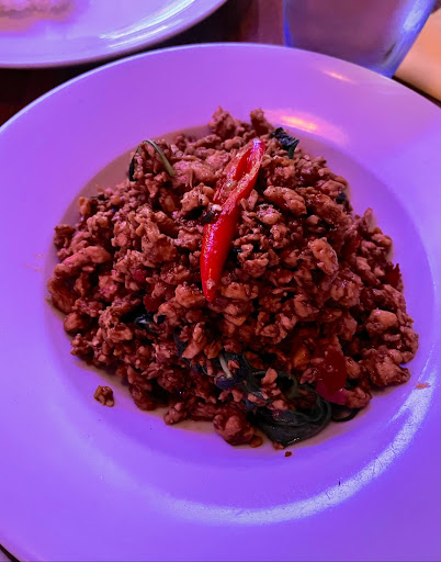 The stir-fried Thai basil with minced chicken is bursting with bold flavors, combining fragrant basil, spicy chilies, and savory minced chicken, perfectly balanced with a hint of herbal and spicy. The tom yum shrimp is equally impressive hot, sour, and aromatic, with fresh herbs and plump shrimp in a rich flavourful broth.
