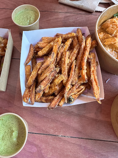 What a great new addition to Edinburgh. It was busy when we arrived for Saturday lunch but we managed to find a spare table. The atmosphere is really nice, especially on a nice sunny day in which it was. There were I think 11 or 12 traders all serving a variety of different cuisines. Ordering was simple through the QR code but you can also order with the menu and also by speaking to the trader themselves. I went with the French cuisine at What le Duck. I had the confit duck burger with orange chili jam which was absolutely delicious!! The jam was the highlight for me. It was also a generous portion. With the burger I got a small fries with rosemary salt which were pretty good. I also got some haggis and duck bon bons which were tasty. I got a truffle mayo to go with which was quite nice. My wife got a chicken burger from Chix, which she appears to enjoy, and also a waffle fries which were also pretty good. The bbq sauce was damage. The service was mixed. One gent that served us was a bit expressionless and appeared a bit disinterested. The other girl that served us was a bit churpier. Waiting times were quite quick despite how busy it was. We had a girl singing and playing her guitar next to us which was a nice to have on in the background. Overall a good experience. You could argue that it was a wee bit expensive but the food was really good so you canât complain too much. Iâll be back to try the other traders another time.