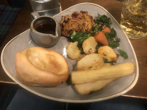 Veggie approved! I was looking all over Edinburgh for a vegetarian Sunday roast. I could not believe how difficult that turned out to be! Luckily for me Greyfriars Bobby’s came through. They had a delicious nut roast bursting with flavor, roast carrots, parsnips, potatoes, crispy kale and a Yorkshire pudding. The entire meal was spectacular, my only critique would be the gravy was a little bland. I’d recommend adding a little red wine to give it that extra twist. My dad has his haggis (not pictured) and enjoyed that as well. The desserts were also good, but I think the main dishes were the best. I LOVED the elderflower cider and am hoping I can find it in a shop back in Oxford. It was very fruity and the elderflower was very strong. Overall a great meal and a nice location. I was glad to see that they had several interesting vegetarian (and I think one vegan) dishes. All too often veggie fare is typically a veggie burger or a salad, so it was nice to see some variety, and more importantly a good meal. I definitely recommend this place. It’s pretty regularly priced in my opinion, definitely not as cheap as Spoons but it’s not horribly expensive either. Thumbs up from me.
