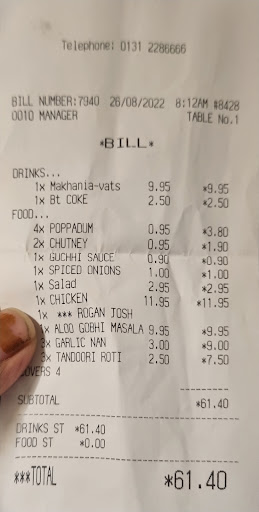Wow, where to start… you will see a sign that reads kids eat free on a Tuesday. Bank this for later!! So on entry at 8pm there were 2 people eating and when we asked for a table the waitress looked surprised!! 1st warning sign. Then we sat and a chap came over for the order, turns out he was eating on the table occupied and was still eating while he asked for the order. After we ordered (2 adult mains and 1 child) he offered us 2 popadoms, we said yes. Also ordered some drinks, they arrived swiftly along with 6 popadoms and 6 condiments. The popadoms tasted like they were not fresh but ok. Our young son wanted a butter chicken and my wife and I ordered chicken tikka curries. After an hour we were still waiting for the food and when it can we were shocked to say the least, the butter chicken was a curry with a slab of butter dumped on top. The naan breads were literally dripping with butter, I mean dripping to the point they were soggy!! We were a little shocked and embarrassed at first. Then our son tries the butter chicken after I scooped the slab of butter off, it was hot, spicy hot and for anyone who knows a butter chicken this shouldn’t be the case. After a short while we realised no one would come and ask if everything was ok, standard in most average restaurants!! I decided I would go and find the staff, she was hiding behind a wall in a stock room on the phone, I asked her to swap the naan as it was not edible, she looked at me like I was an alien and went to replace it. Eventually it came back and was 100 times better. We finished and asked for the bill. Now, we eat out a lot and we simply couldn’t believe the bill!! £73 for 3 curries, ( one not touched due to the heat) but where was the kids eat free? That’s not the best bit, oh no…. They charged us £1 for the 6 condiments each and 6 popadoms we didn’t ask for!! That’s right £12 for what we were told were 2 popadoms!! In addition they charged us for 2 rice, we ordered 1. The waitress came over and I complained about the butter chicken, the naan breads and the condiment’s/popadoms issue, she went and got the manager and I explained we would not be paying for food that was not ordered or edible. Also when asked about the kids eat free he simply said no they don’t do it!!!! As you will see from the photo it’s advertised in the shop front!!! Eventually we paid £40 reluctantly as the food we did eat was poor, the replacement naan breads were nice and the drink also ok, although I ordered a bottle beer and they gave me a draft beer pint, almost forgot about that, I got charged the extra for that too!! All in all, the food was poor and the service worse. Avoid this so called “restaurant”. It’s shocking and you will feel like you have been mugged once...