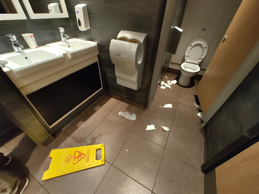 Bonus points for the half-empty KFC cup on the sink. It adds that lived-in, “we-cleaned-this-last-week-maybe” charm. And let’s not forget the Dyson hand dryer — it actually works! Which is great, because with all the scattered paper, it's clearly the only functional drying option left.