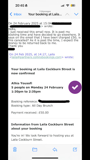 Read moreWorst customer service. I tried to book a table for brunch. To do this you must enquire and wait for a response. They responded to me the next day almost 2 hours after the time slot I wanted saying they have a table, I told them it was too late as I had to stick to a schedule for my trip. I tried to book again the next day and this time they asked for a holding fee of £50 for 5 people so I assumed they would book instantly and confirm. Again they did not respond to me until the next day. We ended up going to another brunch spot, I didn’t think I would be charged because they didn’t get back to me. But after checking my emails they had sent a confirmation for the table. I had booked the table for 13:30 and they sent me the confirmation for the 13:30 table at 14:30 and had said that £50 payment was received. Again this was an hour later than the time slot I wanted as we had to stick to a schedule for the day. At this point I had already eaten at another brunch place and was shocked that they confirmed my table so late and still took my £50 deposit. I contacted them via email explaining the situation and the response was extremely unprofessional. They responded with “so why did you pay the deposit then?” Ridiculous question because in order to secure the table you must pay a deposit. I explained this and asked for a refund but they have ignored me since. I have emailed multiple times and all my emails have been ignored. The lady’s name who emailed me is called Lisa. She was extremely rude, unprofessional and didn’t care to sort out my issue. To save your money and time, do not visit. It is not worth it. Edinburgh has many other great brunch spots to visit. Worst experience I have ever had considering I gave this place another chance.