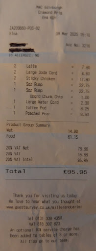 Having dined at Miller & Carter in Bristol, who absolutely knocked it out of the park, we decided to try their establishment at Cramond Brig. Firstly, the entrances into the carpark are a bit tight and they are right off the main road out front. We were coming from the Forth Road Bridge end and nearly took our front suspension out as there is a huge pothole in the road there. Although the noise hitting it sounded like something had broken, nothing seemed to have been damaged. We parked up. There are a good number of spaces in the carpark but if you have a large vehicle it might be a bit tight. REMEMBER and register your number plate inside to avoid getting a parking ticket. Also, beware of all the cars parked on the street and because this is a cycle lane lookout for bikes. We went to the reception where we were greeted immediately and taken to our table. We had pre booked our table the night before as this place is always very busy. Our server 'Elsa' came over and took our drinks orders, then our food. We went for the Sensational Sunday 3 course deal £35.95. First out came our wedges of lettuce, then our starters, then our steaks and finally, our puddings. Sorry, but I'm not a great fan of the lettuce wedges. Even though it had a bacon dressing on it, this was left. The starters, sticky chipotle chicken was well cooked and tasted great, our only complaint was the pea shoots garnishing it were a bit limp. Our rump steaks again were cooked perfectly. I felt that the peppercorn sauce could have been a bit more peppery. My wife loved the red wine sauce with her steak. I paid extra for chunky chips (£1.00) but was a bit let down. They could have been chunkier and they did look and taste like McCains frozen chips. The fried onions served with the steaks were a bit overdone, crunchy on the outside and greasy on the inside, these were left. Our puddings were poached pear and sticky toffee pudding. We were a bit let down by these. The pear tasted good but the coconut sorbet was icy and didn't taste of coconut. The sticky toffee pudding had a grainy feel to it, like it was slightly underdone in the microwave. During our meal, we ordered a soda water and diluting orange and a blackcurrant and lemonade from one of the male servers. Unfortunately, he brought back soda water and fresh orange and a blackcurrant and water. I was fine with the blackcurrant mistake, but soda and fresh orange isn't very nice to drink. To all credit, though, this was replaced with the correct drink, no questions asked and an apology, so top marks for that. They do have a smart casual dress code. Special mention to our server Elsa, who was polite, prompt and well presented. A credit to the establishment. The server who got the drinks wrong, maybe needs to pay a little more attention when waiting tables. One more disappointment was a mistake in our bill, which we didn't notice until we checked the bill at home. Our food should have come to £72.90 because of the Sunday deal, as advertised on their website, the drinks came to £14.80 total, including the vat the total bill should have been £87.70 but we were charged £95.95 and we left a 10% tip. All in all it's a nice place to eat, albeit more expensive than some other restaurants which we wouldn't mind paying but for the small niggles above that...