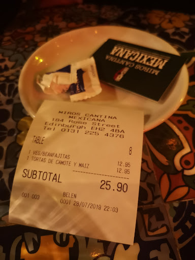 Read moreI would avoid this place at any cost. There are better Mexicans and other restaurants in Edinburgh. Firstly this place is expensive for the type of food being offered up. There wasn't much on the menu that excited us so we plumped for one main each. The menu is meat heavy so not great for vegetarians. The service was very slow. We waited 50 minutes from ordering to receiving our only course. For a restaurant that doesn't have a lot of covers and whose dishes have similar bases this is unacceptably slow. The worst part of our experience was the food. It was so immensley bland and disappointing and the primary reason why we have given one star. Mexican food shod be vibrant, full of flavour and with a little kick of chilli. The food was so incredibly bland and flavourless. We tried each others food and both dishes were watery, totally devoid of flavour and were made with poor quality ingredients. The cheese for the fajitas was the cheapest mild cheddar going. As I said to the waitress when we gave feedback, I would be disappointed if I had cooked this food at home. The service was also lacking. When we very politely provided feedback on the meal the waitress said 'well there is nothing I can do'. Umm yes there is. We were then informed their card machine was broken, so I had to walk to Princes Street to get cash. When I returned it took the staff 10 minutes to take the money and give change. The wait staff were more interested in clearing tables than taking payment. I would never return here even if I was offered a free meal. Even the Mexican food in Wetherspoons is better. Edinburgh had lots of great restaurants, save your time and money and go to one those and at all costs avoid Miro's...