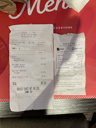 Ā Ā Ā Read moreIf could give zero star I would as this experience was the most terrible. I came for 3 days trip to Edinburgh with my sister and her partner and came in to this food place to have dinner. My sister and her partner ordered a vegetable Ramen soup which was reminding us of a dish washing water, it was no taste and no vegetables in the ramen. Was the most disgusting dish I ever seen in my life, no taste. My dish was an egg noodle sweet n sour chicken. The egg noodle was tasting like a watery over boiled pasta and chicken was tasting fridge and watery. We complained to the waitress who was very rude and tried to explain this dish should taste like this. We ate so many times this dish in Wagamama or other noodle places in Manchester and the tastes was totally different. After the dishes we all had belly pain and diarrhoea. When I said to the waitress I donāt like the dish she didnāt offer any discount or anything. I only ate couple of spoon from my dish and I left it. I never leave dish on the table but I was scared if I eat it Iāll have food poisoning. When the waitress came over I explained her I donāt like the dish and is not tasting anything like it should be taste. She was very annoyed and laughed and said to me āfirstly this is not a pasta this is an egg noodle and secondly it should taste sweet n sourā I replied back to her this is the main problem this dish doesnāt even taste sweet or sour it just taste water. I offered to pay her even I shouldnāt but she didnāt even offer any discount. We split the bill and my dish price was 10.50Ā£ and she even charged me 11.50Ā£ for I donāt know what reason.