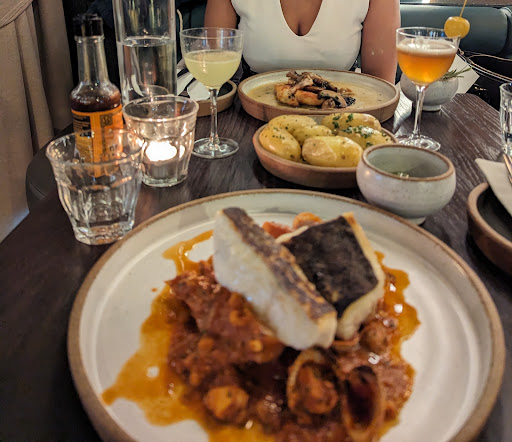 For mains we had the steak and the fish stew. Mains arrived immediately after we had finished our starters, there was no break at all. The steak was well cooked, although we were not given a choice on how we would like the steak or were told how it was going to be cooked. It came with a relatively boring rocket salad and way too much flavourless parmesan. The steak was also significantly underseasoned. The fish stew, was a piece of white fish (not sure what fish it was, as the server didn't know) on a bed of chunky tomato sauce, with two prawns and 5 clams. The fish was beaufully cooked, however the rest of the dish was not great. The prawns were overcooked and the tomato sauce tasted as if it was just slightly cooked down crushed tomatoes from a can. It didn't seem as if there was any seasoning in the dish at all. Which at £22 is quite upsetting.