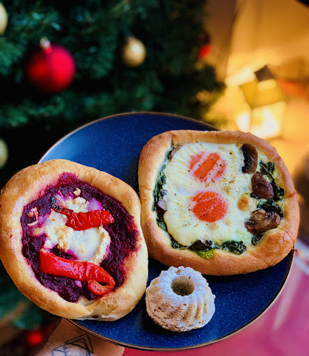I both two focaccia’s one with beetroot, goat cheese and roasted pepper, the second with spinach, eggs, mushrooms and truffle oil. Also I get one pistachio bundt.