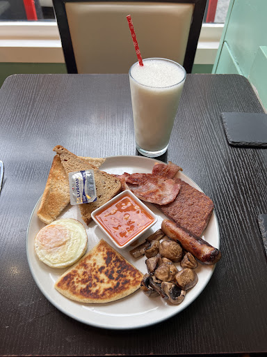 Read moreVisited Quinn’s Cafe on a Summer Tuesday morning around 9:30am. I had seen the reviews (4.9 stars on Google) and thought I might as well check it out. I wasn’t expecting to get a seat considering that I was going solo and that is was late morning. I had assumed that they would prioritise couples and groups over a solo diner. I was happily proved wrong! I arrived and walked in without waiting to be seated (was a bit silly of me). It’s quite a small space for dining with limited tables. Immediately this really kind server asked if I was sitting in or taking food out. All the tables were taken so she had me sit at the back in a corridor with four high-chair seats. I sat there for around 5 mins and she came and took my order. Within those 5mins, a couple left from a table near the window. I, again, assumed that the server would give another couple the table over me (a solo diner). She was incredibly kind and prioritised me because I had walked in before the couple. Although this may seem like a very small gesture, it demonstrated to me that although profit is important, this owner and the server prioritise customer service above everything else! I could be totally reading into this exchange, but even so it made me feel appreciated just as much as the couples and groups. The atmosphere was brilliant with both the cook and server thanking everyone as they were arriving and leaving. It felt very cosy and personable. The Full Breakfast and Vanilla Milkshake were delicious. Everything cooked to perfection, and the server/cook happily explained everything on the plate to every customer in the cafe. The single server was attentive to every group and/or person in the cafe, making sure to clear tables as soon as someone left. It was clean, the music wasn’t too loud and they take cash or card. I would 1000% go here again. I would just like to mention that if you are part of a large group (4+) you may have to wait outside to be seated. Obviously depending on how busy it is, but because this place is highly recommended and small in size you might be turned away. Lastly, there are toilets inside and free WiFi. It isn’t really accessible for wheelchair users because there are stairs in the middle of the cafe. Plus because it is a small space it may be hard to navigate through the tables and chairs if in a wheelchair. That’s one downside to the area. But apart from that, it was a great dining experience....