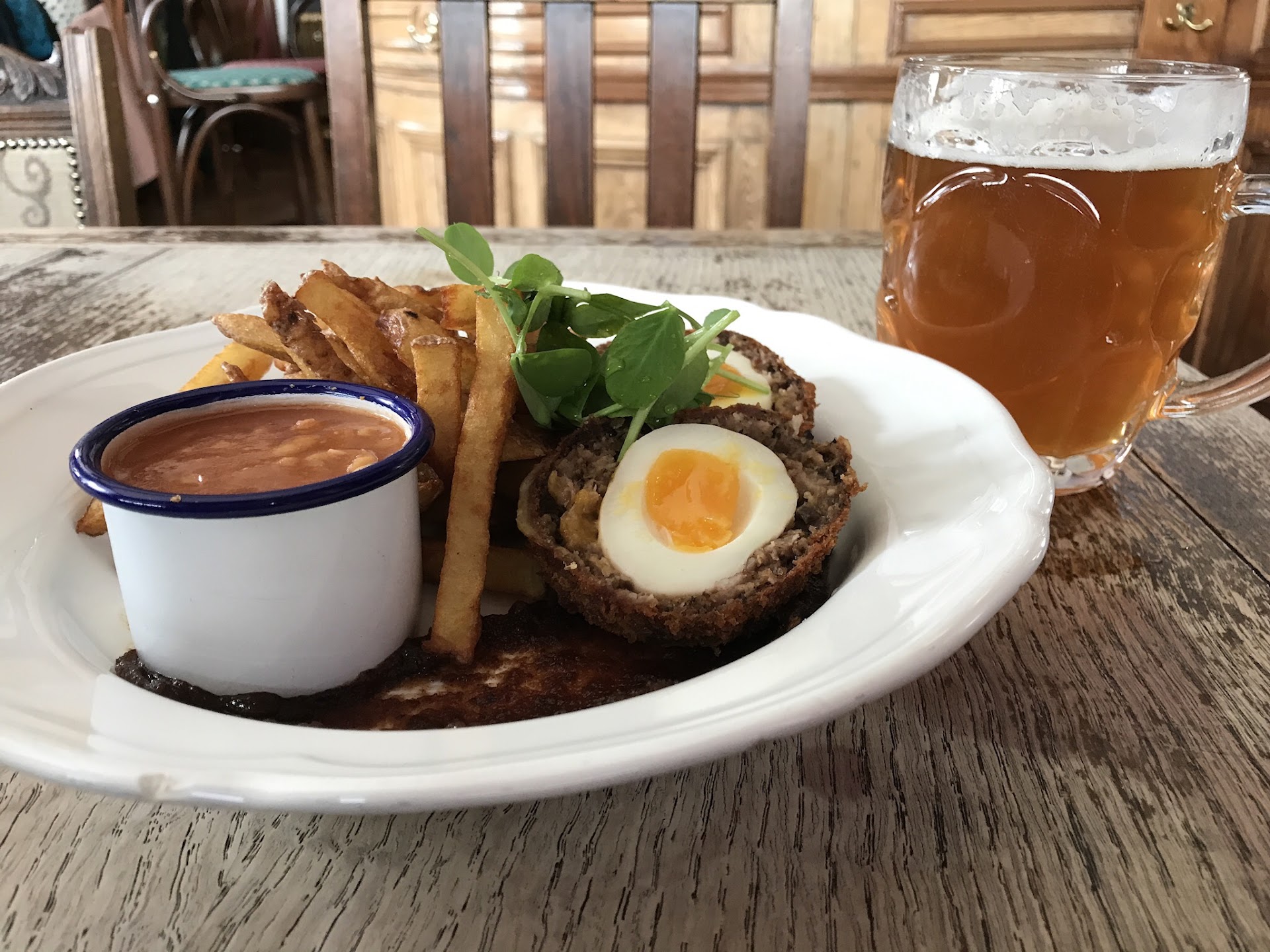 Read moreI was there for lunch and I couldn't turn down the guest ale, that was a delight, but food was my main goal. I was not disappointed. There is quite a selection of vegetarian and vegan options that were not at all dull usual stuffed pepper afterthoughts. I find this a good sign. Indeed everything on the menu fit the quirky ethos of the place whilst still sounding impressive. I eventually decided upon the Leith al' eggs. A wonderful take on a scotch egg, wrapped in haggis and pork sausage served warm and a touch runny with the yolk. Served with skin on double dipped chips, baked beans and a sweet pickle preserve.