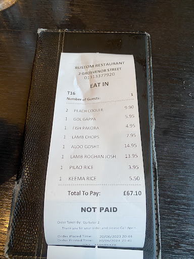 We agreed for the same and moved on, the order was a pulao rice with Palak panneer and Dhal Makhni. The spinach dish was ok however could have been less oily and the panneer was softer compared to the tawa tikka served as starters. The dal was pathetic.. there was no taste, just loaded with butter and very bland and horrible, we decided not to taste anymore food, we decided to eat the spinach and rice and decided to call it a night... While we were waiting for the bill, finally another waiter observed that we had not had the dal and he took some steps to get some feedback, he then brought the manager who again was amused that we had bad things to say about the food and he also urged us to come back again and try another version of the daal which would be better than what was ordered ( Tell me if you know that only one dal is good then wont you remove the other one or advise the clients on some ideas).. He also made a statement that he was thinking if he should compensate me for the issues noticed.. to which my reaction was that I was not wanting a refund of sorts but just wanted to be heard clearly of the issues I saw in the food which was way below the bar and at most 1 star level.. there are road side stalls in the sub continent and some big cities who serve better quality of service.. We least expect is empathy and waiters who are not too loud,, the waiters of Rustom need a class in being grounded.. get a service attitude and think that the customer is important at every...