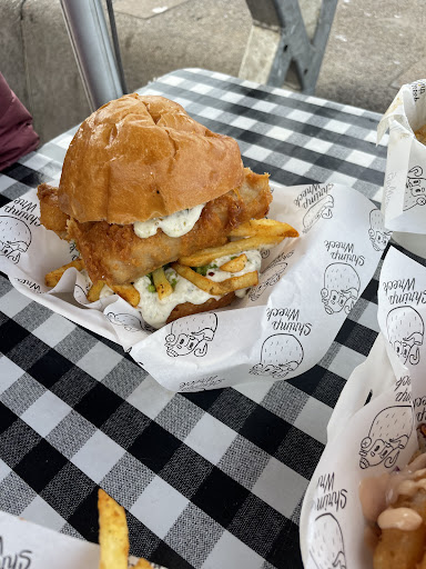The wife and I went here last night for some dinner! Thankfully it had just stopped raining so the prom was quiet. We got served straight straight away by nice lady. I got the shrimp bun, my wife got the fish finger sarnie and we shared the crispy squid and old bay fries. We tanned the crispy squid first which was quality! I thought they’d maybe be a little crispier but they tasted great! The garlic mayo it came with made it even better. My shrimp bun was terrific. Amazing flavour and it was super juicy. My wife’s fish finger sarnie was also well approved. She loved it in fact, producing uncontrollable mmm’s. Both buns were substantial in size. The only negative I could think of was that the buns could do with an upgrade. They struggled to contain the contents so maybe with a better quality bun then they do a better job. Saying that, they tasted fine, and the messiness was quite humouring. Finally, my expectations for the old bay fries were pretty low as I thought it would just be bog standard fries mixed with old bay seasoning, and maybe it was, but they tasted great and were very indulgent. It was also a huge amount, so good value. Overall, we throughly enjoyed our scran at shrimpwreck. The service was faultless, the food was brill and the value was good. My new fav place to eat...