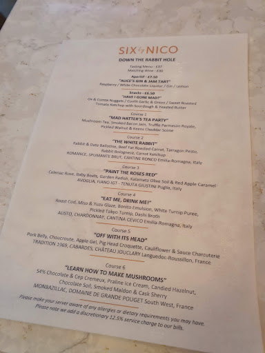 Read moreI'd booked this as a treat to myself and it definitely was. It was such a creative menu. The theme was Alice in Wonderland - Down the Rabbit Hole. My favourite dish was The White Rabbit (I'd never tried rabbit before and they set the standard high) Although they were all very tasty so was really hard to pick one. My favourite thing about the first course "Have I gone Mad" was the mushroom tea and bacon jam. I loved everything about the second course "The White Rabbit" this was my favourite. I was surprised I enjoyed the tarragon pesto, as I'm not usually keen on pesto, but theirs was amazing and the carrot ketchup was a nice touch. The third course "Paint The Roses Red" the celeriac rose and radish was lovely. Course four "Eat me Drink me" The cod was amazing along with the turnip puree and I loved the pickled Tokyo turnip that was a tasty surprise. I was glad a spoon was with this meal as the broth was really nice. Onto course five "Off With It's Head" I'd never tried pork belly before the chouroute and apple gel was nice and the cauliflower had a nice flavour. I admit halfway through this dish I was stuffed, but I obviously still had a little room for course six "Learn How To Make Mushrooms" Chocolate cremeux and praline ice cream with candied hazelnut, finished off the meal perfectly. The rice paper menu was a novelty that had everyone quite taken by it, a good conversation piece. I decided to keep mine for later and only had a bite. Leigh Anne's customer service was great and she offered an aperitif and snacks first. Which sounded lovely, but I opted to go straight into the first course. I'd considered the matching wine option, but as it was lunch settled for a large glass of rose and a bottle of tap water, so I could really appreciate the different flavours of each meal. The bathroom was clean and I liked the branded handles, attention to detail all the way through. I considered leaving this out but felt to be honest I'd include it. Only a couple of very little things that didn't really bother me, the lack of music to begin with. Hardly surprising as I was in the first sitting at 12.15 and it was really busy. Sitting near the door was a bit drafty to begin with, but soon warmed up. I did notice the baby change was behind the bathroom door. Meaning they had to wait until the bathroom room was empty to use it, as it blocked the door. To be honest I never took my boys out for meals when they were that small, the two babies that were there were really good. The staff were all friendly and professional despite it being so busy. The 2 hours flew past and I throughly enjoyed my visit. I'd definitely recommend it and can't wait to try...