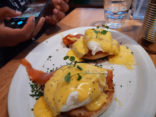 The full Scottish breakfast, which is a humble but usual fanfare of fried egg, bacon, sausage, Haggis, baked beans, mushroom, grilled tomato & crestfallen-despondent toast which decent as a meal, but the Eggs Royale blew our minds. The cooked to perfection poached eggs, placed on a bed of smoked salmon & topped with the creamiest flavourful Hollandaise sauce. The Eggs Royale looked good, tasted great and was a well balanced meal, bursting with flavours. I would recommend it over the full scottish breakfast. They serve breakfast till 3pm and have an interesting lunch menu as well. If the weather is pleasant, they do have outdoor seating, which I am certain has its own...