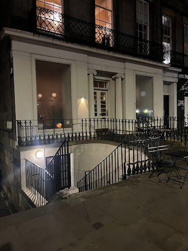 A short Walk from John Lewis and St James shopping mall down Leith walk. Spry offers a minimalist setting with white walls, black-and-white artwork, and shelves of bottles on display. Seating options include modern Windsor-style wooden chairs and a mix of low ankle-height tables, small round tables, and higher bar seating. The lighting is subdued, with spotlights highlighting walls rather than tables, complemented by four globe pendant lights. The open-plan bar doubles as a kitchen, allowing diners to watch the two chefs at work.