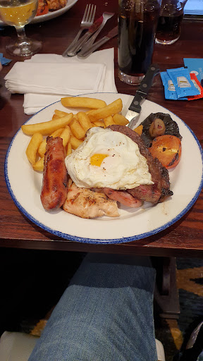 We booked here for 7.20pm for 4, after ordering our food and drinks at about 7.30pm we then waited 15 mins for our drink to arrive and to make matters worse the bottle of prosecco we ordered was not chilled, we then ask for an ice bucket to chill the bottle but were given a cocktail jug full of ice 🤷♂️ which was no use at all, we then waited 35 mins for 1 starter of nachos and then a further 40 mins for our main meals, even then it was wrong, I had ordered a medium rare steak and my partner medium to well, after receiving our meals we both realised they had been cooked to order but were on the wrong plates, I ordered a mixed grill and my partner a surf and turf which were served to us on very small plates with everything pilled up on top of each other which wasn't ideal when we were trying to swap steaks, I know it a minor point but I think if you order those kind of meals they should served up on big oval plate to make it a bit easier to eat, our friends also received there meal about 5 mins before ours which meant by the time we received ours they had ploughed through half of theirs, don't get me wrong the food was good so hats of to the chef's but the overall experience was bad, the service was terrible and not at all attentive, in fact we were not asked once how our food was or if we needed any condiments, the cutlery was brought to us but that was it, and only after we asked how much longer we would have to wait for our food did the manager come over and apologise for the wait, the only saving grace was the food in my opinion, my steak and egg was cooked to perfection, the gammon, and chicken were good and our nachos starter was nice, it's just a shame the service was terrible and let...
