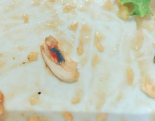 Finally, by the end of a salad, we found something blue (looked a bit like blue cleaning cloth) stuck to a piece of onion. (goodness knows how much of the cloth we'd already eaten!) but by this point we couldn't be bothered to raise yet another issue with the staff... So just left and vowed not to return to Huffkins. There are much better...