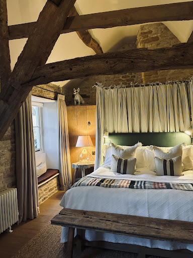 My partner and I recently stayed for 1 night and also dined in the restaurant. Overall, we had a great experience and would highly recommend. We stayed in the Masters room which was BEAUTIFUL and exceeded our expectations. The interior was so perfectly styled and the room was very spacious. Although of course not at all expected, I did think in hindsight that having a small welcome token on arrival (just something little like a welcome drink, baked good from the farm shop etc) may have made it feel extra special, but doesn’t take away from how great the room was. The bed was super comfy and we loved the towels and underfloor heating in the bathroom! When we arrived, the room was a tiny bit cold and although it heated up by the time we returned from dinner, it may have been helpful to pop the heating on a little earlier to ensure it was warm when we arrived. We went downstairs for dinner where we had a cocktail in the bar before going through to the restaurant. Despite it being a Monday night, there was a lovely buzzy atmosphere - it could easily have been a Friday evening. Our food was lovely- we both had steaks for our main course which were well cooked and tasted great. I did ask our server if we might be able to order a sauce for our steak but it eventually turned out this wasn’t possible. I suppose this is fair as there wasn’t a sauce on the menu and maybe the chefs were busy, but I did think that this wouldn’t have taken too much additional effort for the chefs to make. Regardless, it didn’t take away from our enjoyment of the meal overall and we loved the soft serve ice cream for dessert - simple yet delicious. Breakfast was also great and we had a choice of 2 courses from a varied and interesting menu- not just the usual full English which was nice! Staff were friendly and helpful throughout! Overall, a perfect spot for a luxurious yet relaxed break! Would...