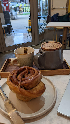 Read moreFirst visit, been meaning to go here for ages and wish I had sooner! New favourite café. I had a flat white and it was the first coffee I've ever had without sugar/ syrup/ sweetener because it tasted so good it didn't need it - turns out I've just been drinking rubbish coffee! Had it with a very yummy toasted tomato, mozzarella, and pesto bagel. Then I had a pot of a lovely peach and apricot tea with the most amazing cinnamon bun.
