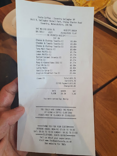 Read moreOn arrival at the Gallagher Coventry Costa we received a warm welcome from the lady who took my order for 2 large lattes and 2 toasties, these were all very hot as you hope for. We had eaten and just started drinking lovely hot coffee when we informed by the other member of staff that 'they were closing in 5 minutes' this was followed by total attitude when we said 'our coffee was still too hot to drink quickly' and he offered to pour the remainder into takeaway cups which we rejected. I asked him for a refund on the coffee so we could go elsewhere which he refused to do citing that the till did not do refunds after closing time, although there was a couple of minutes before closing time. We were not informed when ordering that there would be a time limit and we had not realised they closed at 5 o'clock. I've given 2 stars because the food and coffee was...