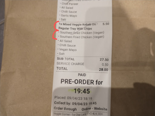 When I stopped eating meat veggie corner was what got me through that first year. Since moving from sandy lane it has gone down hill year after year. I still would order every so often from the new ball hill location. But after what they delivered the other day I feel compelled to write this… their naan bread WAS honestly the best I’d ever had (so fresh and tasty). I order a SFC (which was ok) in a naan bread and if I wasn’t hungry it would have gone in the bin. I can only compare it to a Asdas own frozen naan bread. How can you go from being the leading veggie food establishment in Coventry to know being leagues behind McDonalds!! I understand the cost of living crisis but you’ve pretty much doubled your prices, while halving your portions… with quality of products it seems none existent. Just remember when you were at sandy lane it was the veggies and vegan of Coventry that pushed your business to what it is today via word of mouth, posts on social media, taking friends/family members that would never have gone on their own. Very upset with what’s happened...