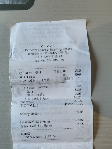 Due to work, I travel a lot across the UK, and while on the roads, I often eat in Zizzi. I went for dinner on the 31st of January 2024 around 6-7 pm while working in Coventry. I ordered winter caprese, lentil ragu and ice cream, and a great waitress served it. Around 4 am, I woke up, got diarrhoea and started vomiting from the food I had eaten the night before in Zizzi restaurant. I was weak and exhausted all day, and on my way back home, I went to Zizzi Coventry and told them that I had food poisoning. A young woman who introduced herself as a manager disappeared after I shared what happened to me. Then, a rude waitress said that it was impossible to get food poisoning symptoms that early since I ate at 7 pm and started having symptoms at 4 am the following day. She also said that if I had food poisoning, that could be only from the food I ate at home earlier. Her comment and ignorance concerns how little she knows about hygiene and food health and safety. Furthermore, a guy who introduced himself as a chef came and repeated the same story that it was impossible to get food poisoning from the food I ate and the time I got symptoms. He added that I might have a lactose intolerance rather than food poisoning- like I don’t know my own body. The lack of knowledge from the chef concerns me more. I am also appalled by their absence of customer service and common humanity to ask someone if they were ok since they told you they were unwell. I told chef that I often eat in Zizzi while on work travel, I left contact details, and the chef said he would investigate and let me know. I never asked for money back. I came to let them know what happened to me so they could avoid food poisoning someone else. The manager never returned to talk to me. Since the 1st of February 2024, I haven’t heard from Zizzi. It is beyond belief how lightly they take customers' comments on the food they serve. I recovered a couple of days after this, and I left this review to warn others about what can...
