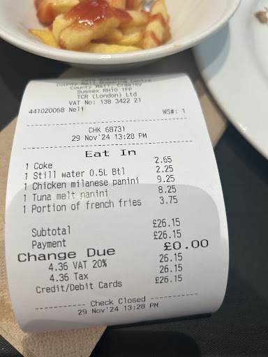 Read moreDon't bother. Very very over priced for what it is. Asked for a tuna melt panini priced at £8.45. Got to the till and added a pre packaged brownie slice (same size you get with a meal deal) and an iced tea both. The bill come to £16.35 which i questioned and they told me the brownie and iced tea are £3.95 each! I asked for both items to be removed off the bill as I thought it was overpriced. Same cost as the panini! The staff then stood there gossiping about how I was complaining about the price in front of me while I was eating. Zero customer service once I'd asked for those items to be removed, no napkins given, no smile, i was just bitched about instead. Won't be returning. Restaurant prices for below par food and sub standard...