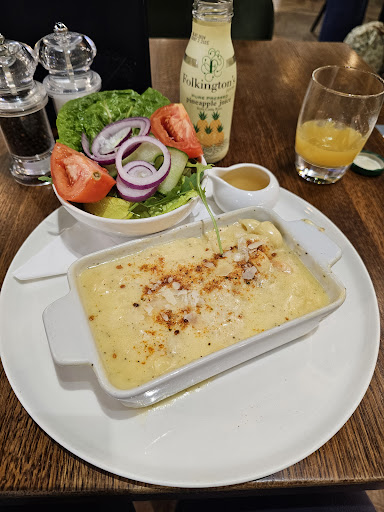 Excellent experience from beginning to end! Host and waitress were fantastic: smiley, professional, knowledgeable and hard working. I had the seafood mac & cheese. Mac & cheese is usually not at all of my taste, but this one wasn't overcooked, had lots of sauce and seafood, and the cheese didn't overpower the taste of the seafood. It came with a fresh and crunchy side salad and a dressing that was a delight (lemony but not overpowering). I also had a perfect peach Bellini, served in an appropriate glass. I wasn't going to have dessert, but the main was so good that I ended up trying the triple chocolate dessert that was an absolute delight, very indulgent and freshly made. A lady near me had the salmon with bread and the presentation was flawless, as much as my food was. She seemed happy. I asked for the dessert and the bill at the same time, as I was about to go to my gate, and the waitress listened and did exactly as I asked. As I was leaving, the host wished me a good flight. Perfect experience, I can't fault absolutely anything. Thank you! ❤️