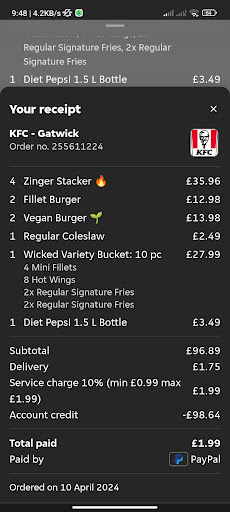 I could go on but the point is the staff are NOT trained to deal with questions about the site when clearly there was a problem. KFC Care Squad basically will lie to you and are a waste of time trying to explain a genuine problem and could not care less about the THIRD PARTY that they DO work with that try to con and intimidate you by sending threatening demands. I will not ever use a facility like this and basically will never use KFC again. Rant over but bad...