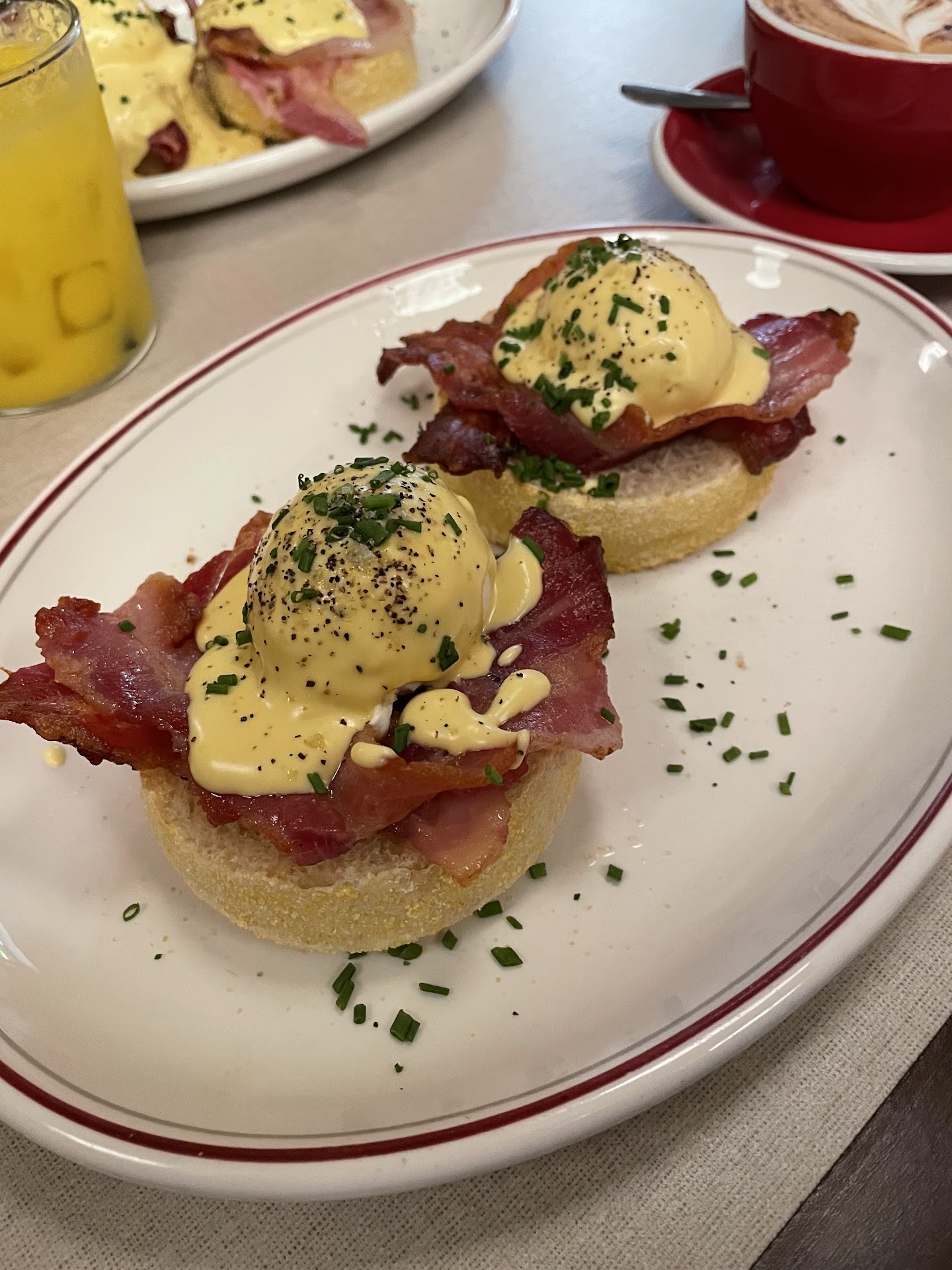 We ordered eggs benedict, most of the portion is a thick muffin, the bacon is American style and rather crunchy which made it difficult to cut with those tiny wannabe knifes (airport cutlery…) and the muffin. The hollondaise was nice and smooth. The poached eggs looked like they could star in an advertisement - perfect egg shape and cooked to perfection. The outside was very stable so it didn’t break apart as soon as it got touched.