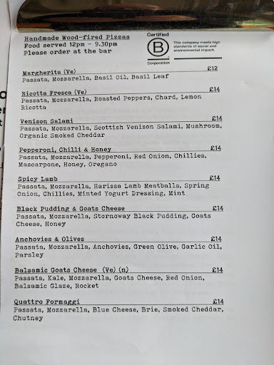 I'm ashamed to say that I've several times walked past this place to go to the establishment next door. I didn't know what I was missing, but I made it there today. I've had some black isle brewery beers years ago, but I didn't appreciate how they've developed, or what a range they have. We tried several, with my favourite being an oatmeal stout, which at 7% alcohol was served in half pints. I also had a nice IPA called spider monkey. Beers are organic, and the pizzas are made on the premises, with either their own products, or other locally sourced ingredients. We ordered a spicy lamb, and a black pudding and goats cheese pizza and shared them. They were both wonderful and I couldn't make up my mind which I liked best. I expected to prefer the lamb one, made with their own Hebridean sheep, but I think the black pudding and goats cheese probably shaded it. Staff were cheerful, confident and helpful. Food and drinks were ordered at the bar. Tables were large, designed for sharing, and the place was busy, with a lot of people eating, and some just having a beer. All- in - all a very positive experience, and one we are likely to repeat.