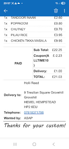 Ā Ā Ā Read morePlaced order through just eat and they rejected blaming the just eat?? But called them offered me 10% discount when on app they offer 30%? How strange called restaurant happy to take order but give me 10% . Absolutely a joke of restaurant, person who text me to show my order was not received, buy my bank shows payment taken.. would not trust these persons as definite not telling truth, now I have to wait for refund. Sent them screen shot off order but even that they not accepting, so I recommend not to use as they don't want to honour what they state on app which I'm sure is what they should under the...