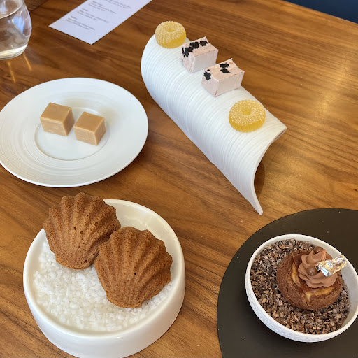 We now moved to the cheese course and this was not good for your arteries. Vacherin Mont d’Or with wiltshire truffle honey on a crumpet was absolutely delicious. The palate cleanser that followed was definitely needed after that. The Bergamot , ginger , pomelo , yoghurt was lightly creamy yet lovely and refreshing. This led us to dessert and as beautiful as it looked the taste matched the presentation. The Valrhona Opalys Chocolate with mandarin and yuzu was the perfect way to finish.