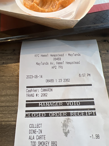 Read moreFood was cold chicken taste like cleaning fluid....I suppose I should be grateful they use cleaning products considering the tables were dirty when we tried to find somewhere to sit, even food on the chairs. I returned the food and explained it was cold, taste of cleaning product and a burger had sauce which we didn't want. The order said no mayo or ketchup. We got given a plain burger FOUR times before I asked for the manager. I explained I wanted a burger with No mayo or sauce he did quite understand what I was asking for repeating did I want a plain burger. Eventually he offered me a refund. When I checked my bank I couldn't see it pending so asked if it went through. We resolved the issue I said thank you and just as I went to leave the guy said yeah don't come again. I said excuse me he said you heard me so I asked for his manager he said he was the manager which was a lie. I eventually got to speak to his manager who said I was banned because i made a complaint about the food. I've never laughed so hard. I was polite throughout and was treated like the food they cook,...