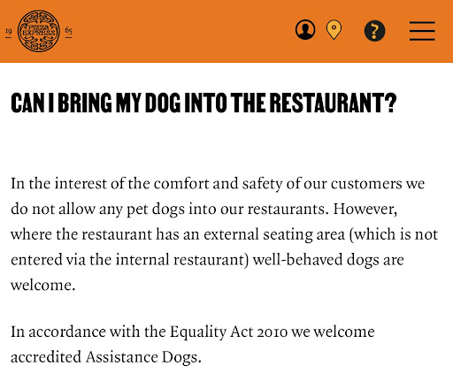If PizzaExpress head office are wondering why their midweek numbers are so low in Berkhamsted, they perhaps should review the guidance they give their customers and staff, following an unpleasant experience we had tonight. Having read that dogs are welcome at branches (see screengrab) that have a terrace (Berko has one, it's lit up with festoon lights and the tables have flower pots on them), we asked if we could eat outside with our dog, Jeff. That was OK, but the terrace doesn't officially open until tomorrow, we're told by an unsure but accommodating waiter (perhaps the mayor is coming to cut the tape).