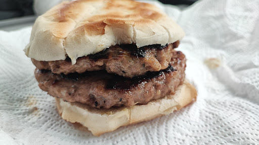 Freshly made burgers, freshly made sausage patties, tasty bacon and runny eggs.