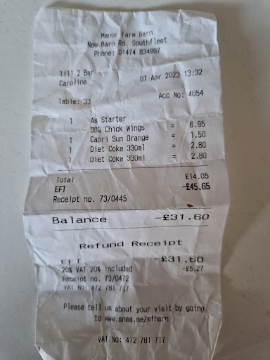 Hi everyone who fallow and who is reading my reviews( please read up to end ) . This time I have pop in in this manor farm barn for Sunday dinner and I have to tell you all something I have been in this place couple of times last time was about year ago and I have dissident to wrote reviews about this place first time when I have visit it was amazing atmosphere good delicious food fresh and I say to my self I will pop in in near future then I come with my friends second time and I had small disappointment quality was little drop and finally I pop in yesterday again . Do to power cut off in my town and we dissident to go somewhere to eat and we come here and let me start my last experience about this place . We pop in we got seat for our dinner and order food food didnt take much time to wait about 10 minutes . Before we start ordered my wife noticed fort is dirty and then I look at mine it was same we ask them to replace . Order couple drinks next to our meal my favourite beer Guinness and my wife get lemonade with gin . Finally we got our food ready and we start enjoying your dinner together but their it was start everything go down . I order chicken grill with vegetables With chips and guess what I got 1 skewer on that skewers 3 tiny chiken bits basically 1 peace divided in 3 peace it was looking like chicken popcorn. If that would be tasty I would love that but not it was so dry like dried beef jerky vegetables was burned sorry for chef but that's what he did . Then I taste fried chips and those was tasteless over cooked in old oil my wife sed to me take extra skewer for 6£ I said that will do this time for me not to hungry . I don't know who is chef was but definitely this fella done food for us not deserved to call chef even microwave chef dose better food then this fella .( I hope manor farm barn manager team will pass this to kitchen staff this ) let's continue for my wife dish and she got haddock fish and chips . You can see from picture that fish is not fresh dark brown what it will tell you old oil over burned same us with chips . Let's continue with haddock fish it when my wife get bite she noticed that fish is off and I took bite to see it and guess what they cooked old fish to served to customers to make profit sorry to tell you you loose 2 good customers and hope next customers will read this review and don't go there . Do I come back ? Hell no way I come this place again!!!! Do I recommend to come ? Stay away from this restaurant better go any other take away food then this money waist to come to this place !!!!! If it helps you please press like and fallow for...