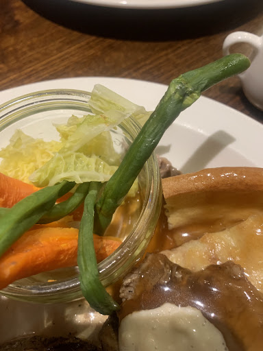 First time we received a large gravy boat each. The 3rd time a tiny coffee cream jug. The first time the meat was OK. Subsequent visits the meat became tougher and more chewy. My partner asked for vegetarian (no meat but extra veg) and his plate arrived without meat and no extras. In fairness when we enquired they did send out a fresh dish of veg. The veg on the 3rd visit was limp and looked microwaved. Please see image. It's such a shame because we are small eaters and ordered the small size which was great value (at least on the first visit)