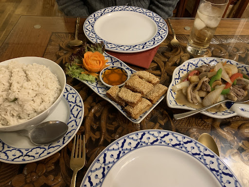 As long as you're not expecting culinary fireworks, this is actually a fine choice. Given the menu, though, we had certainly hoped for more vibrancy and inspired or authentic cookery. Yet, we were not entirely disappointed by what we got. In some respects, for the kids the somewhat watered down and conservative Thai style may have been more palatable. The restaurant itself is larger than one may expect and decorated to the theme. It's a shame that it shows its age not only aesthetically, but also by the set epoxy glue seeping from the seems of various heavy wooden chairs. Service was friendly and reasonably swift. The dishes, simply put, had more in common with with oversweetened and somewhat bland Chinese takeaway than super fresh, aromatic, and energetic Thai cooking enjoyed elsewhere. The chicken satay needed at least double the ration in peanut sauce and lacked a flavour punch in both marinade and sauce. The battered fish was a good portion, swimming in a large quantity of very sweet rather than sour indistinct sauce, and regrettably was not crispy. I also doubted it was the red snapper that was promised. (When used in my own version of Thai green curry it certainly has more texture and flavour.) That said, the prices are fair and with adjusted expectations your meal here will...