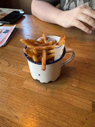 The food wasnât worth the wait. Truly disgusting. The fries were absolutely inedible. They had clearly been cooked in stale oil that hadnât been changed in at least a few days. For anyone who has never worked in a restaurant before, stale oil doesnât just taste bad and bitter, but itâs actually a huge health risk. It can cause diarrhoea and vomiting, which it seems will be the case for us this evening, considering the state of our stomachs now. The chips were also cut so thin that they were either dry little husks or soggy and floppy, leaving half the mug of chips as just congealed smelly mush. Check the pictures attached to see. You can tell just by looking at them that the oil is bad because the fries are brown instead of golden. Completely inedible. Literally the worst fries Iâve ever been served by far, and Iâm not even exaggerating.