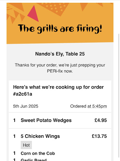 Read moreIt was a normal Thursday afternoon when I was craving sweet potato wedges, so we went to Nando’s Ely as usual. We queued at the front of three couples. It was only 5ish, and the restaurant was about half full. We greeted the staff with a smile, and he showed us to a small two-seater table tucked in a corner near the kitchen. Fair enough, we thought — perhaps it would get busy soon.