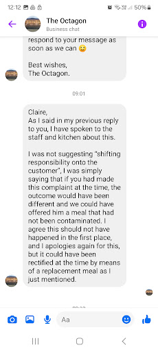 Ā Ā Ā Read moreWe recently visited The Octagon and, unfortunately, had a disappointing experience regarding their handling of gluten free dietary requirements in terms of customer service. Despite informing the team at the time of booking and again when ordering that one meal needed to be suitable for a coeliac, my father's plate arrived with black pudding a product that is not gluten free. When he queried this with the waitress, she admitted it shouldnāt have been on the plate. My father doesnāt like to make a fuss, but this kind of mistake happens ALL the time when we eat out, and itās incredibly frustrating. I want to be fair and say the food itself was lovely, but itās a shame this incident overshadowed our experience. I know that he apologised but the tone of these messages suggests an emphasis on what we could have done differently (reporting it immediately) rather than focusing on their responsibility to ensure the error didnāt happen in the first place. Iām giving a 1 star because I still donāt feel from the messages that Michael is understanding the issue and because he then blocked me when I couldnāt reply to his comment. Totally unprofessional and unwilling to take accountability. As you can see Michael, blocking me has now made things worse for you! If you have coeliac disease, I would...