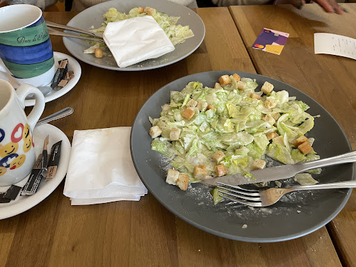 Yesterday we stopped for lunch and both opted for the chicken salad. It’s virtually a Caesar without anchovies, which I asked for but was told they didn’t have any. Slightly disappointing, although fair enough.