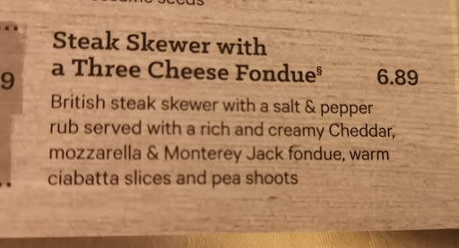 The 2nd part was the "Steak Skewers with a 3 cheese Fondue". Now, let's think what a Fondue is... A pot with cheese (3 types as per menu) held above something to make the cheese melt, with a nice steak skewer, with delicious melt in the mouth steak. What I actually got was a skewer of chewy over cooked meat plastered in pepper and salt and flour that was burned, with 3 slices of dried up bread, and a small bowl, containing more gloop! Yes, another version of a floury based so called cheese.