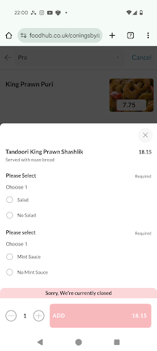 The food was luke warm at best with no spice or flavour what so ever My chicken tika massala was like liquidised baby food with 5 small pieces of chicken... I ordered a garlic nan bread which was sweaty