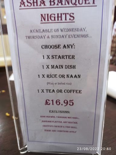 Read moreWe visited this restaurant on the recommendation of friends and I am so pleased they told us about the place. The staff are friendly and welcoming, they showed us to our table and offered popadoms and pickles - we declined as we did not want to spoil our appetites for the 'main event' ! The menu is quite extensive and there are some dishes exclusive to this restaurant as they were actually created by the chef here. After much deliberation, and some assistance from the very knowledgeable staff I chose the Chicken Aashiqi, my dining partner went for the Dev Daas (he was not sure if he wanted lamb or chicken and this offers both in the one dish !). We added Mushroom rice and a Garlic and Coriander Naan to complete our order and sat back and relaxed with our drinks until the food arrived. Wow !! Food was served piping hot, all the flavours were so fresh -- and the Aashiqi -- so many flavours I cannot describe other than to say it is absolutely delicious and something that must be tried ! My partner was also very impressed with the Dev Daas. We will be returning and may try other dishes, but currently we have some firm favourites !! Thank you Asha for lovely food and service, we...