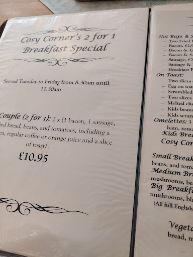 Car was in for a service..8.30am...so asked for a local cafe to hve breakfast,garage suggested Cosy Corner...So on a recomdation i strolled down to the Cosy Corner..a little apprehensive, soon as i arrived i was welcomed with a smile.Took a table and ordered a tea and a medium breakfast. 2 mins ltr alovely fresh pot of tea and pot of milk were bought to the table..5 mins ltr my breakfast arrived...WOW!!...straight away my eyes had started eating.. it looked fresh not dry nor greasy....i soon tucked in..the mushrooms had a slight crispness delicious...the bacon perfect..the egg just as I'd asked for...the beans hot the tomatoes refreshing and the fried bread to die for...and a side of toast..... To finish my review I'd highly recommend the Cosy Corner for the excellent service...the atmosphere and the 5 Star food.....an absolute gem...I now can highly recommend this place to anyone who...