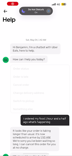 It is now 7.40. I point out that I have waited nearly an hour for order 44 and that order 74 is being served. Perhaps some compensation?