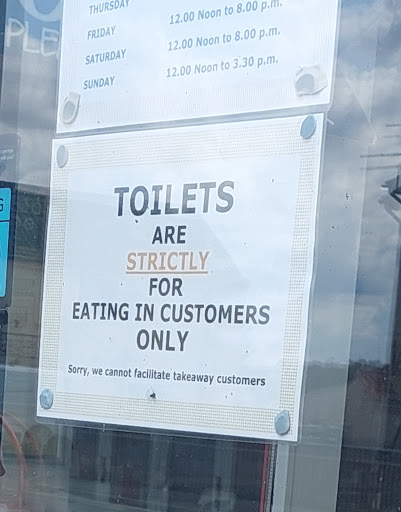 Fish and chips was nice However, I don't understand what the big deal is over the toilets? Surely if someone has chose to spend money with you whether they are eating in or taking out then you should be gracious about it. Yes I am aware that there is toilets across the road but with them being on a steep hill my disabled husband would struggle to walk up it and because we had a dog with us we couldn't eat in and the same rule applies on the outside benches. Maybe think about putting a 30p charge to them so customers can decided if they want to use them or not I just find these signs so arrogant and petty...