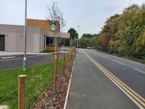 Read moreVery disappointing. I thought the main point of the Starbucks was to be a cafe close to the railway station. If you are using the station, then when you are at the station you would expect to move between the station and Starbucks ON FOOT. True, it is close, but why to they make FOOT customers walk all the way around to the back? Why is the "selling point" a drive through service at the front? Actually, why did they want a prime public transport spot for their business and then ruin it? The picture shows the wire fence around the Starbucks and the drive through on the left. The station access is at the break in the tree line on the right. The Starbucks building is directly opposite it. But to reach the pedestrian access it is necessary to walk along the length of the wire fence, which extends behind the photo, and then around to the far side of the building, and through the path of...